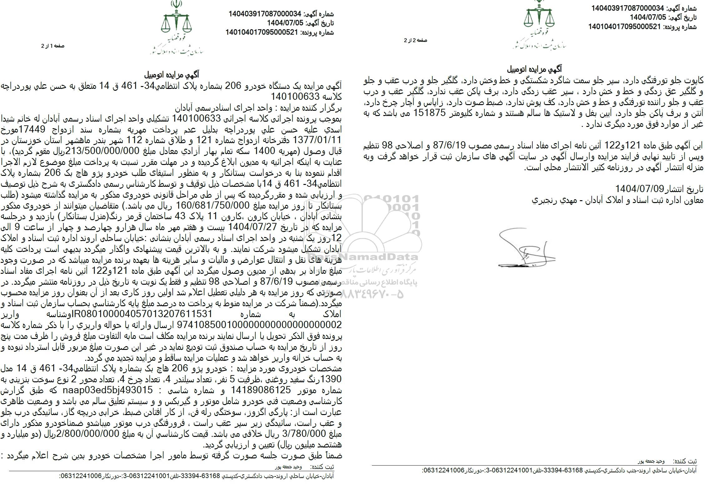 آگهی مزایده یک دستگاه خودرو 206 بشماره پلاک انتظامی 34 461 ق 14 متعلق به حسن علی پور دارچه