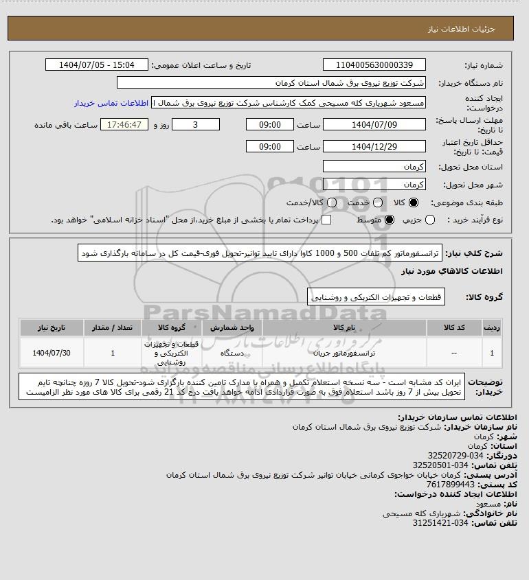 شرح کلی نیاز: ترانسفورماتور کم تلفات 500 و 1000 کاوا دارای تایید توانیر-تحویل فوری-قیمت کل در سامانه بارگذاری شود