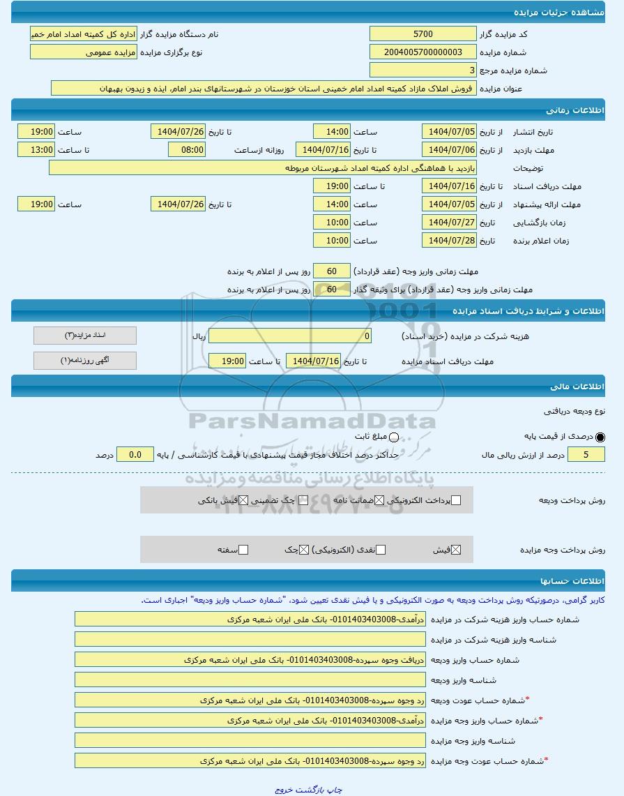 مزایده عمومی مزایده فروش املاک مازاد کمیته امداد امام خمینی استان خوزستان در شهرستانهای بندر امام ایذه و زیدون بهبهان -مزایده ساختمان - برگزار میگردد. از کلیه افراد متخصص و شرکت‌های واجد شرایط دعوت به عمل می‌آید تا در این مزایده با کد خبرگزاری پارس نماد : 9606848 شرکت نمایند تاریخ شروع مزایده : 1404/07/05 مهلت شرکت در مزایده: تا پایان روز 1404/07/16 مکان برگزاری اموال واگذاری استان‌های خوزستان و دسته‌بندی‌های مربوط به این حراجی املاک و زمین میباشد.