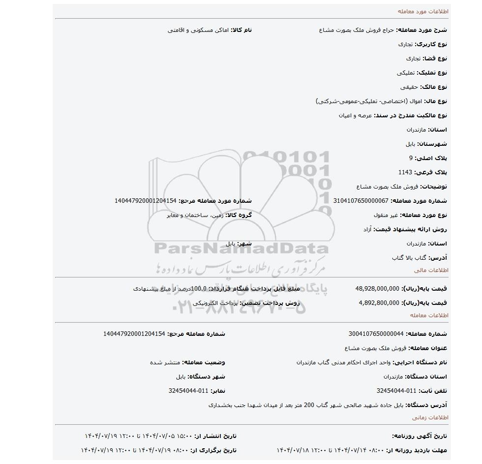 | شرح مورد معامله: حراج فروش ملک بصورت مشاع | نام کالا: اماکن مسکونی و اقامتی | |