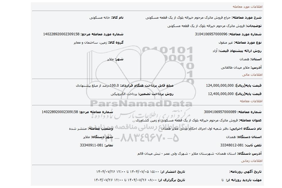 | شرح مورد معامله: حراج فروش ماترک مرحوم خیراله بلوک از یک قطعه مسکونی | نام کالا: خانه مسکونی | |