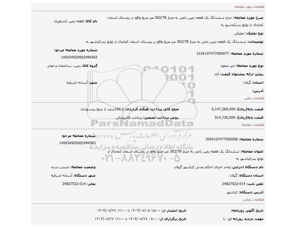 | شرح مورد معامله: حراج ششدانگ یک قطعه زمین باغی به متراژ 302/78 متر مربع واقع در روستای اشمان کماچال از توابع بندرکیاشهر به | نام کالا: قطعه زمین کشاورزی | |