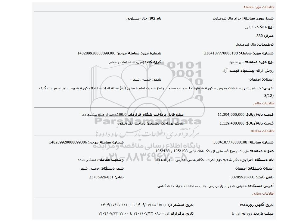 عنوان معامله: مزایده تجمیع قسمتی از پلاک های ثبتی 105/198 و 105/438