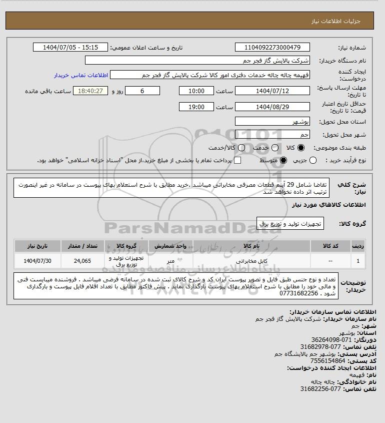 1 -- کابل مخابراتی متر تجهیزات تولید و توزیع برق 24,065 1404/07/30