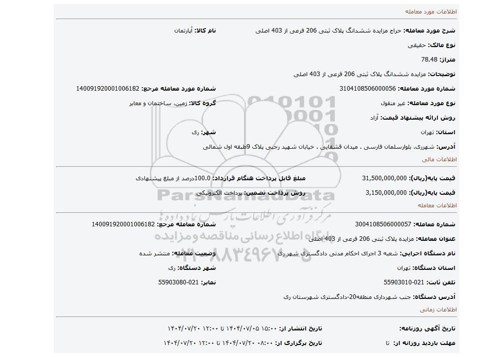 شرح مورد معامله: حراج مزایده ششدانگ پلاک ثبتی 206 فرعی از 403 اصلینام کالا: آپارتمان