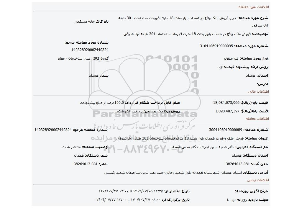مزایده، فروش ملک واقع در همدان بلوار بعثت 18 متری قهرمان ساختمان 301 طبقه اول شرقی