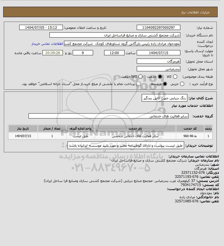 شرح کلی نیاز: رنگ دریایی جهت قایق بندگیر