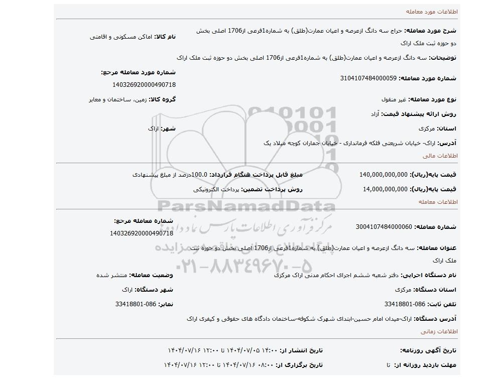 مزایده سه دانگ ازعرصه و اعیان عمارت(طلق) به شماره1فرعی از1706 اصلی بخش دو حوزه ثبت ملک اراک, مزایده، سه دانگ ازعرصه و اعیان عمارت(طلق) به شماره1فرعی از1706 اصلی بخش دو حوزه ثبت ملک اراک