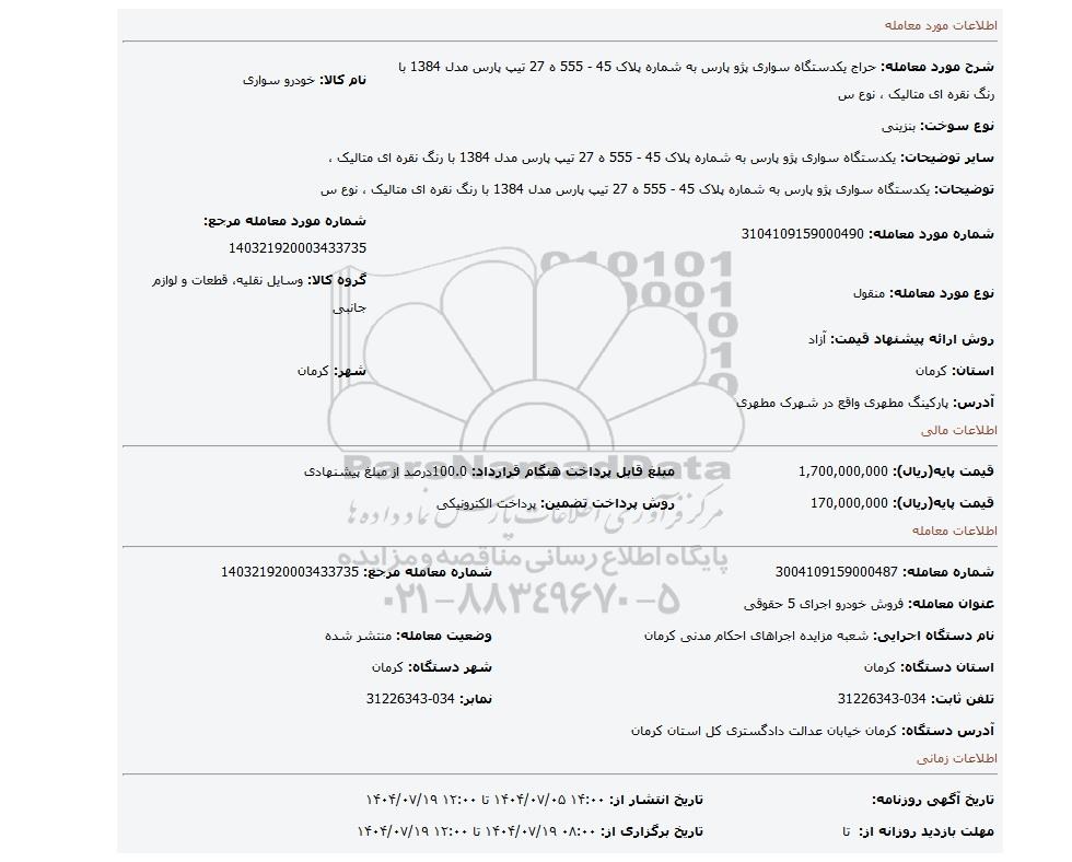 | توضیحات: یکدستگاه سواری پژو پارس به شماره پلاک 45 - 555 ه 27 تیپ پارس مدل 1384 با رنگ نقره ای متالیک ، نوع س | ||