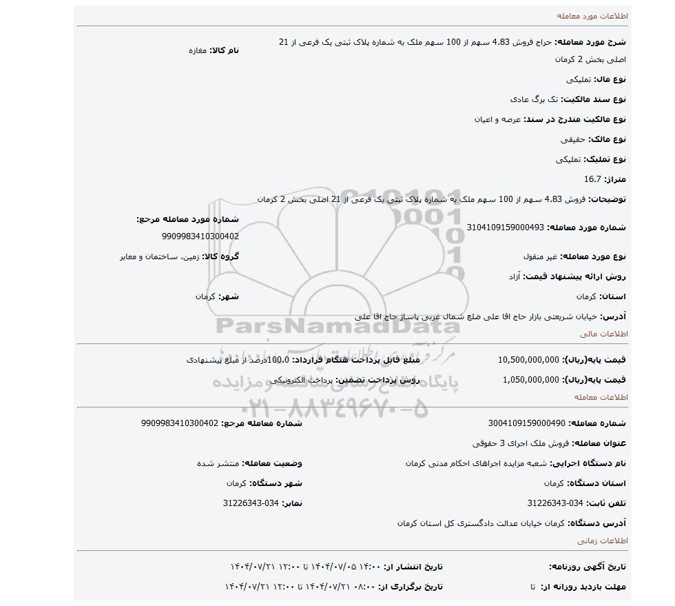 | شرح مورد معامله: حراج فروش 4.83 سهم از 100 سهم ملک به شماره پلاک ثبتی یک فرعی از 21 اصلی بخش 2 کرمان | نام کالا: مغازه | |