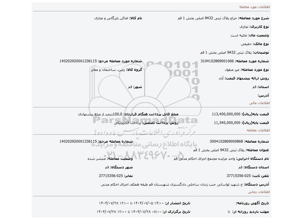 مزایده پلاک ثبتی 9432 اصلی بخش 1 قم, مزایده، پلاک ثبتی 9432 اصلی بخش 1 قم