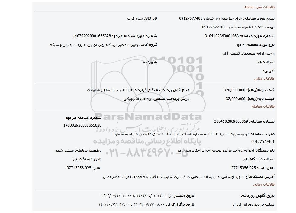 | عنوان معامله: خودرو سواری سایپا EX131 به شماره انتظامی ایران 16 - 529 ق89 و خط همراه به شماره 09127577401 | ||