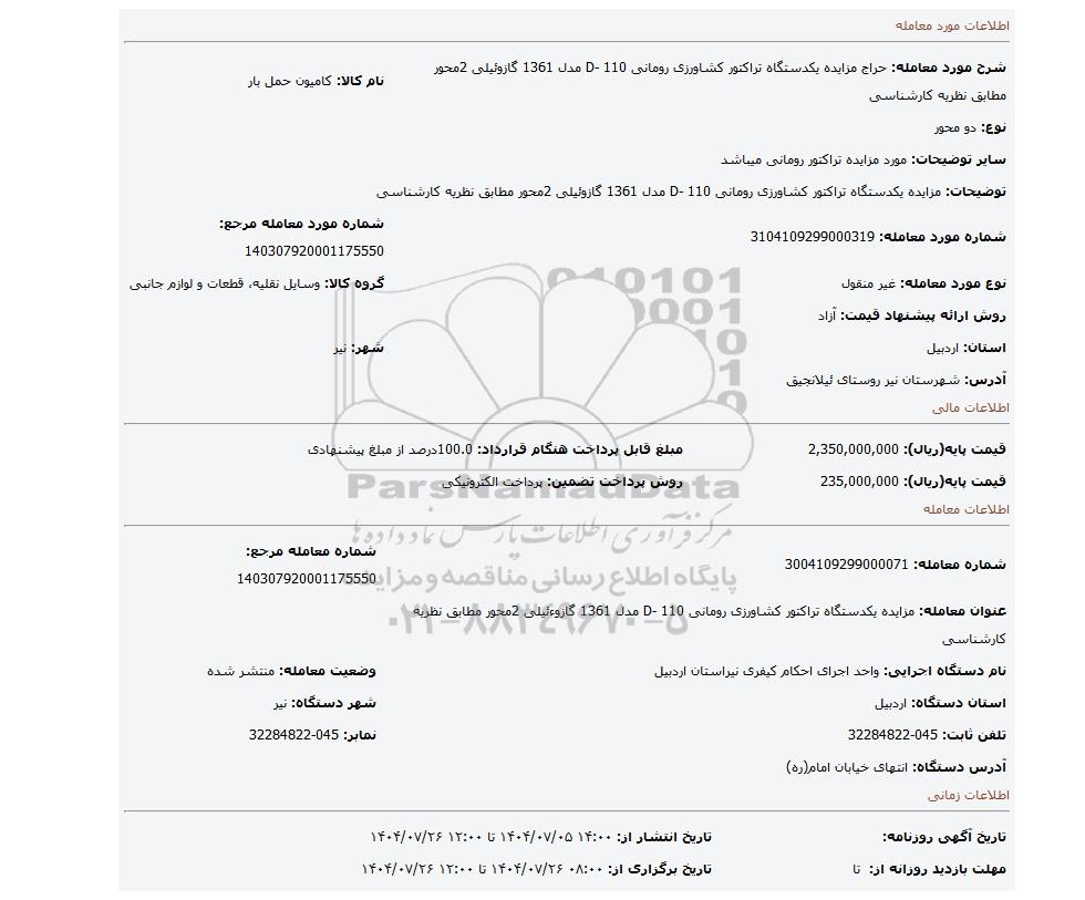 | عنوان معامله: مزایده یکدستگاه تراکتور کشاورزی رومانی 110 -D مدل 1361 گازوءئیلی 2محور مطابق نظریه کارشناسی | ||