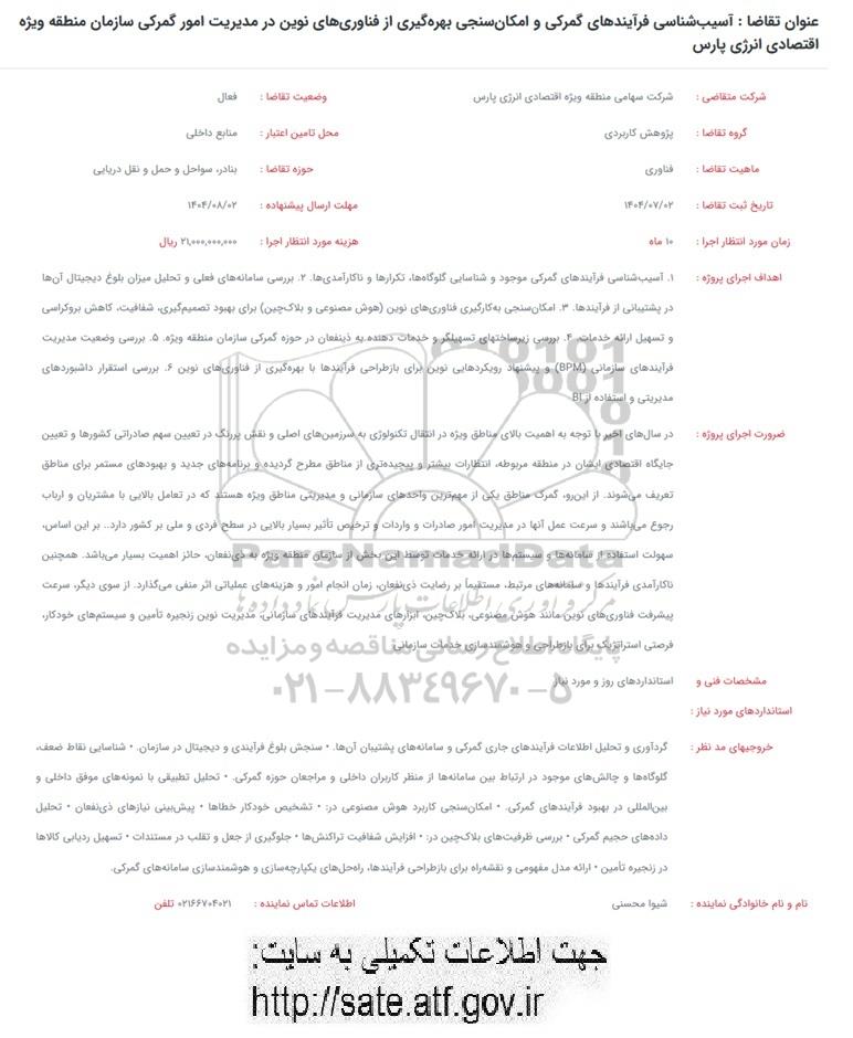 عنوان تقاضا : آسیب شناسی فرآیندهای گمرکی و امکان سنجی بهره گیری از فناوریهای نوین در مدیریت امور گمرکی سازمان منطقه ویژه اقتصادی انرژی پارس