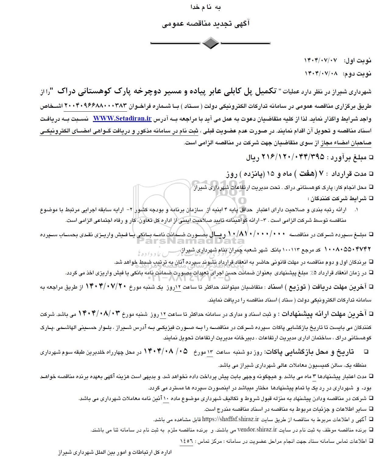 شهرداری شیراز در نظر دارد عملیات تکمیل پل کابلی عابر پیاده و مسیر دوچرخه پارک کوهستانی دراک را از طریق برگزاری مناقصه عمومی در سامانه تدارکات الکترونیکی دولت ( ستاد ) با شماره فراخوان 2004096688000383 اشخاص واجد شرایط واگذار نماید. لذا از کلیه متقاضیان دعوت به عمل می آید با مراجعه به آدرس سایت ستاد ایران نسبت به دریافت اسناد مناقصه و تحویل آن اقدام نمایند. در صورت عدم عضویت قبلی ، ثبت نام در سامانه مذکور و دریافت گواهی امضای الکترونیکی صاحبان امضاء مجاز از سوی متقاضیان جهت شرکت در مناقصه الزامی است.