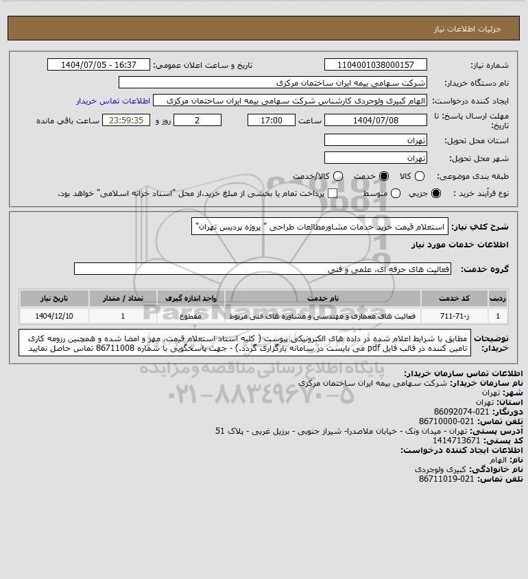 استعلام استعلام قیمت خرید خدمات مشاورمطالعات طراحی " پروژه پردیس تهران", استعلام استعلام قیمت خرید خدمات مشاورمطالعات طراحی " پروژه پردیس تهران"