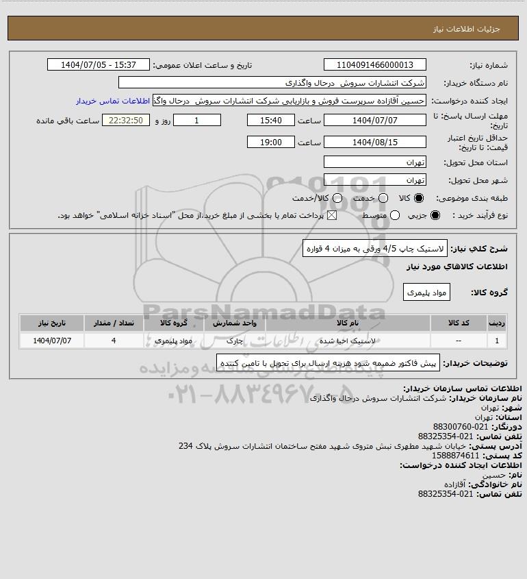 شرح کلی نیاز: لاستیک چاپ 4/5 ورقی به میزان 4 قواره
