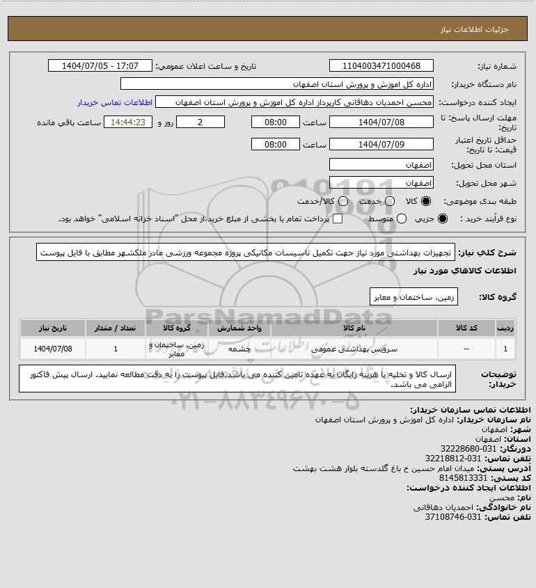 شرح کلی نیاز: تجهیزات بهداشتی مورد نیاز جهت تکمیل تاسیسات مکانیکی پروژه مجموعه ورزشی مادر ملکشهر مطابق با فایل پیوست