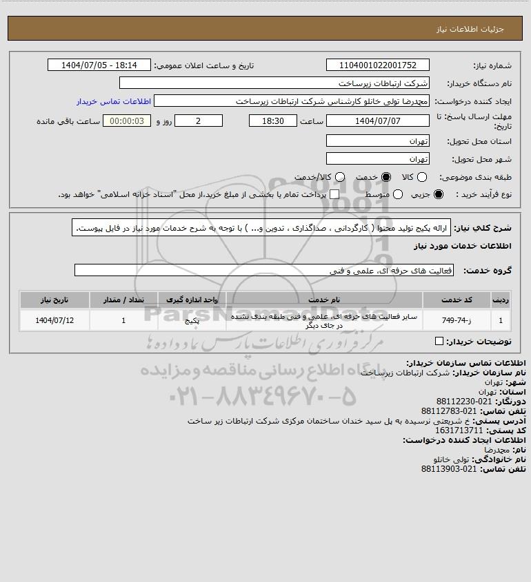 شرح کلی نیاز: ارائه پکیج تولید محتوا ( کارگردانی ، صداگذاری ، تدوین و... ) با توجه به شرح خدمات مورد نیاز در فایل پیوست.