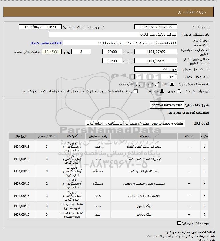 | 2 | -- | تجهیزات تست کنترل کننده | عدد | تجهیزات آزمایشگاهی و اندازه گیری | 3 | 1404/08/15 |