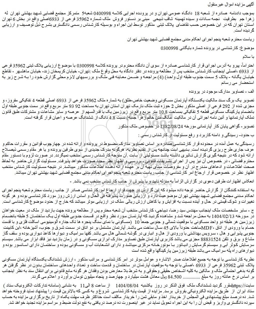 بموجب دادنامه  صادره از شعبه 18  دادگاه عمومی تهران و در پرونده اجرایی کلاسه 0400998 شعبه5  متمرکز مجتمع قضایی شهید بهشتی تهران  له زهرا جم   بطرفیت   نجمه سادات و سیده تهمینه  ثاقب ذبیحی   مبنی بر دستور فروش  ملک شماره 35962 فرعی از 6933اصلی واقع در بخش 6 تهران استان تهران که در این خصوص حسب تقاضای  پلاک ثبتی  مذکور توسط این اجراء و بوسیله کارشناس رسمی دادگستری بشرح ذیل توصیف و ارزیابی گردیده است.