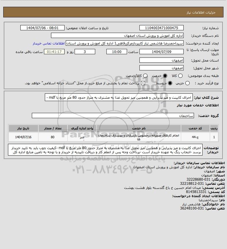 توضیحات خریدار:اجرای کابینت و میز پذیرایی و همچنین میز تحویل غذا به مشتری به متراژ حدود 80 متر مربع با mdf -کیفیت چوب باید به تایید خریدار برسد -انتخاب رنگ به عهده خریدار است -پرداخت وجه پس از اتمام کار و دریافت تاییدیه از خریدار و با توجه به تامین منابع اداره کل
