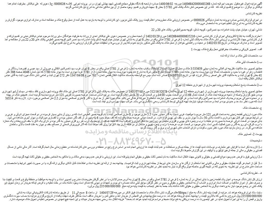 آگهی مزایده اموال غیرمنقول بموجب اجرائیه شماره 140068420000483268 مورخه 1400/06/02 صادره ازشعبه 6 دادگاه حقوقی مجتمع قضایی شهید بهشتی تهران، و در پرونده اجرایی کلاسه 0000026/ ج3 دعوی له علی نیکتاش بطرفیت اخانم هما نیکتاش و دیگران ، با موضوع تقسیم ترکه، که که در این خصوص شش دانگ پلاک ثبتی 1/5781 بخش 8 بجهت فروش و تقسیم وجوه حاصل از آن بین مالکین مشاعی به شرح ذیل کارشناسی گردید