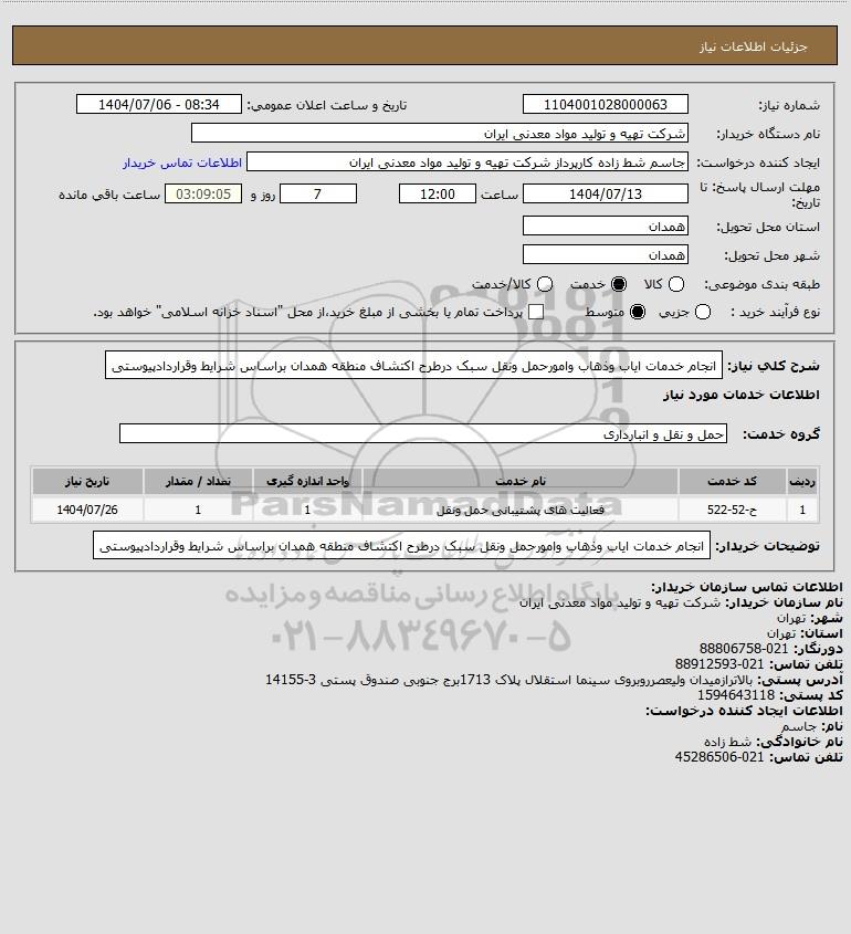 شرح کلی نیاز: انجام خدمات ایاب وذهاب وامورحمل ونقل سبک درطرح اکتشاف منطقه همدان براساس شرایط وقراردادپیوستی
