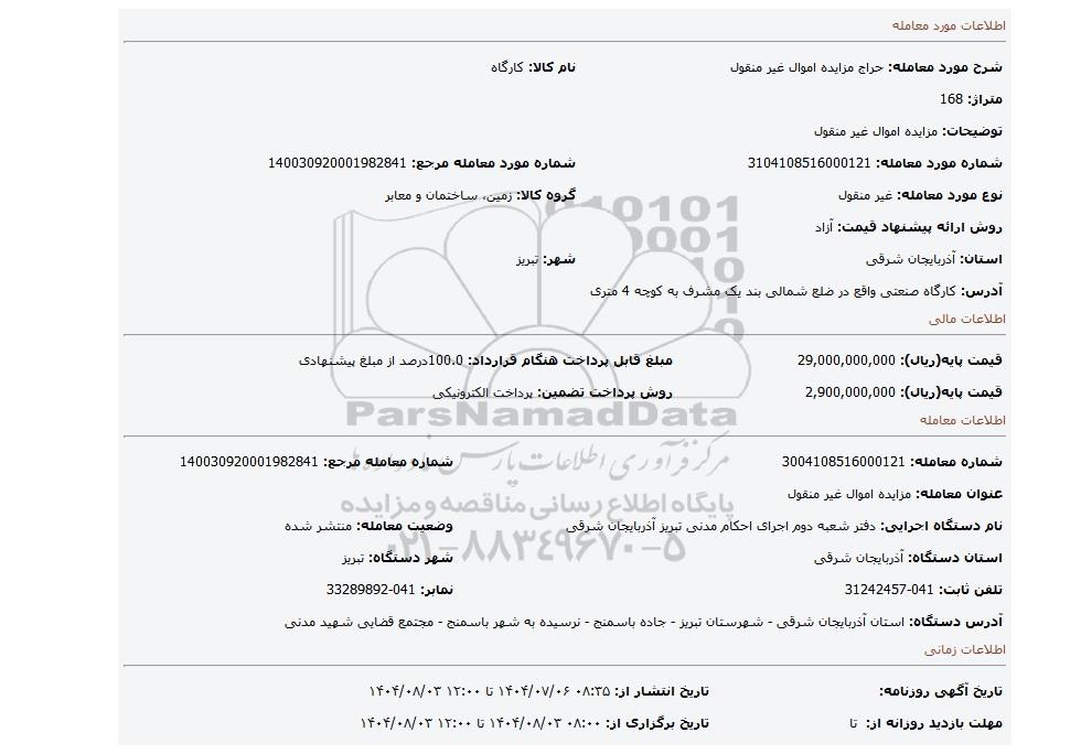 | شرح مورد معامله: حراج مزایده اموال غیر منقول | نام کالا: کارگاه | |