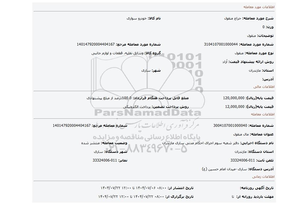 | نوع مورد معامله: منقول | گروه کالا: وسایل نقلیه، قطعات و لوازم جانبی | |