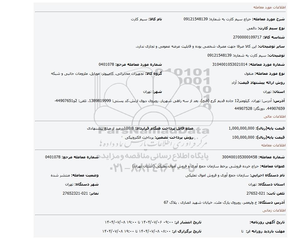 مزایده سیم کارت به شماره: 09121548139, مزایده، سیم کارت به شماره: 09121548139