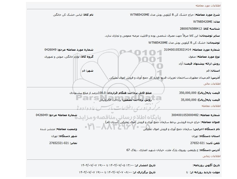 مزایده عمومی مزایده خشک کن 8 کیلویی بوش مدل WTN85420ME برگزار میگردد. از کلیه افراد متخصص و شرکتهای واجد شرایط دعوت به عمل میآید تا در این مزایده با کد خبرگزاری پارس نماد : 9609074 شرکت نمایند تاریخ شروع مزایده : 1404/07/05 مهلت شرکت در مزایده: تا پایان روز 1404/07/07 مکان برگزاری اموال واگذاری استانهای قم و دستهبندیهای مربوط به این حراجی متفرقه میباشد.