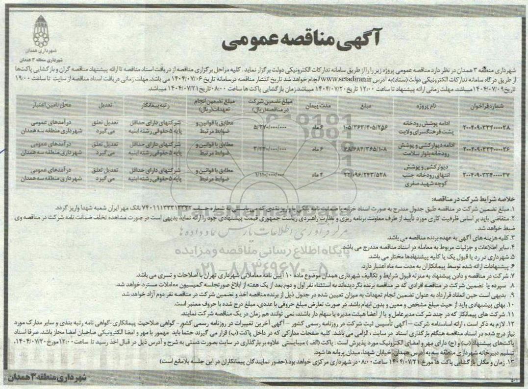 شهرداری منطقه 3 همدان در نظر دارد مناقصه عمومی پروژه زیر را را از طریق سامانه تدارکات الکترونیکی دولت برگزار نماید. کلیه مراحل برگزاری مناقصه از دریافت اسناد مناقصه تا ارائه پیشنهاد مناقصه گران و بازگشایی پاکتها از طریق درگاه سامانه تدارکات الکترونیکی دولت (ستاد) به آدرس سایت ستاد انجام خواهد شد. تاریخ انتشار مناقصه در سامانه تاریخ 1404.7.06 می باشد. مهلت زمانی دریافت اسناد مناقصه از سایت تا ساعت 19 تاریخ 1404.7.09 میباشد. مهلت زمانی ارائه پیشنهاد تا ساعت 12 تاریخ 1404.7.20 میباشد. زمان بازگشایی پاکتها ساعت 8 تاریخ 1404.7.21 میباشد.
