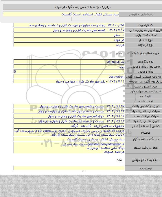 مزایده عمومی مزایده مزایده ۲۴ قطعه از اراضی کاربری مسکونی- تجاری روستاهای تکه لر شهرستان گنبد و باینال شهرستان کلاله و چن سبیلی شهرستان آق قلا برگزار میگردد. از کلیه افراد متخصص و شرکتهای واجد شرایط دعوت به عمل میآید تا در این مزایده با کد خبرگزاری پارس نماد : 9609209 شرکت نمایند تاریخ شروع مزایده : 1404/07/06 مهلت شرکت در مزایده: تا پایان روز 1404/07/12
