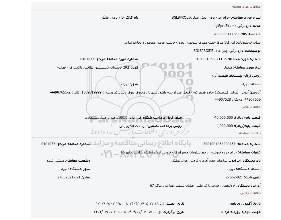 عنوان معامله: حراج خرده فروشی برخط سازمان جمع آوری و فروش اموال تملیکی (استان تهران)