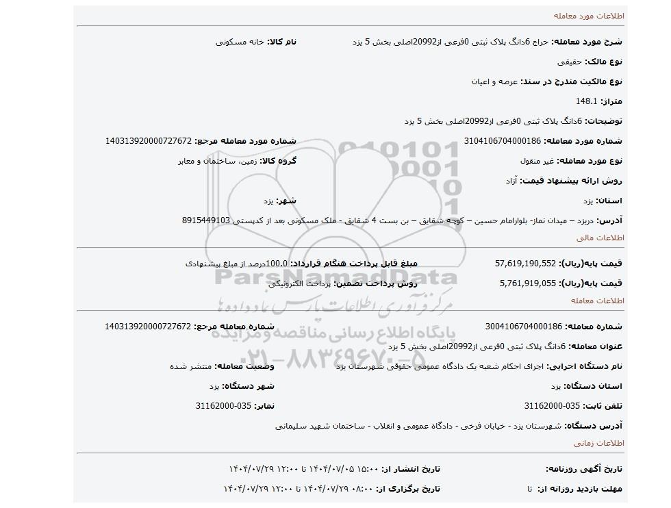 | شرح مورد معامله: حراج 6دانگ پلاک ثبتی 0فرعی از20992اصلی بخش 5 یزد | نام کالا: خانه مسکونی | |