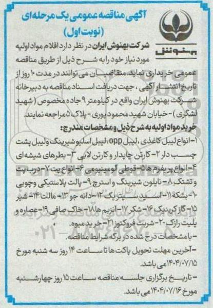 شرکت بهنوش ایران در نظر دارد اقلام مواد اولیه مورد نیاز خود را به شرح ذیل از طریق مناقصه عمومی خریداری نماید متقاضیان می توانند در مدت 10 روز از تاریخ انتشار آگهی جهت دریافت اسناد مناقصه به دبیرخانه شرکت بهنوش ایران واقع در کیلومتر 9 جاده مخصوص (شهید لشگری - خیابان شهید محمود پوری - پلاک 5 مراجعه نمایند.