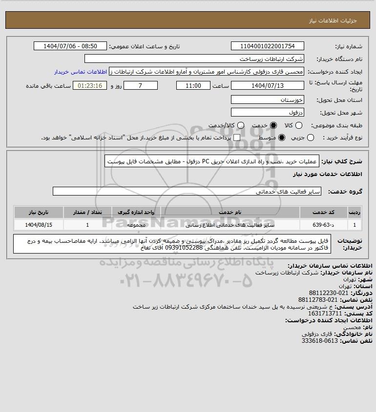 شرح کلی نیاز: عملیات خرید ،نصب و راه اندازی اعلان حریق PC دزفول - مطابق مشخصات فایل پیوست
