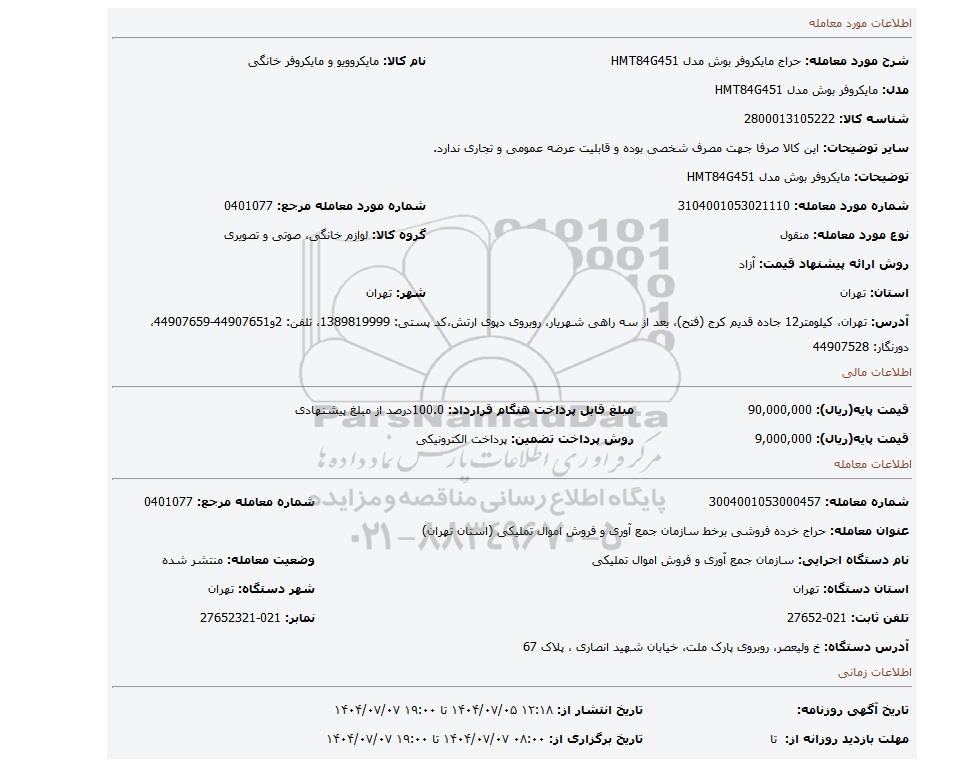 | عنوان معامله: حراج خرده فروشی برخط سازمان جمع آوری و فروش اموال تملیکی (استان تهران) | ||