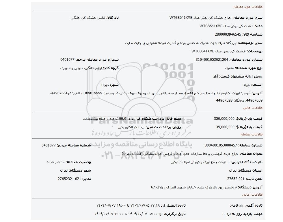 نام دستگاه اجرایی: سازمان جمع آوری و فروش اموال تملیکیوضعیت معامله: منتشر شده