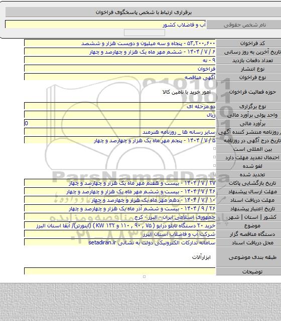 مناقصه خرید ۲۰ دستگاه تابلو درایو ( ۷۵ ۹۰ ۱۱۰ و ۱۳۲ KW ) (اینورتر)/ آبفا استان البرز از کلیه افراد متخصص و شرکتها واجد شرایط دعوت به عمل میآید در مناقصه با کد خبرگزاری پارس نماد: 9609850 شرکت نمایند.