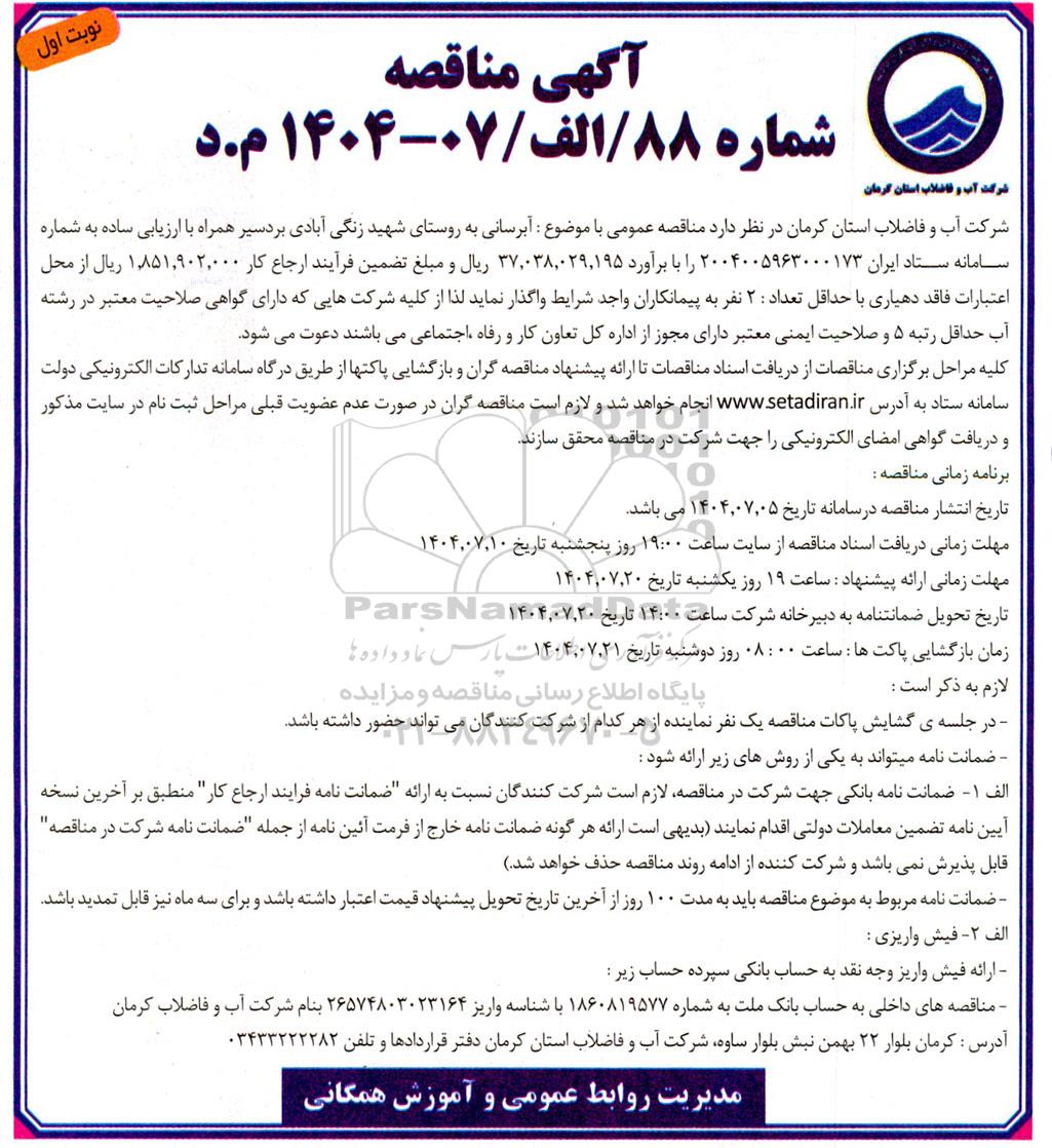 شرکت آب و فاضلاب استان کرمان در نظر دارد مناقصه عمومی با موضوع: آبرسانی به روستای شهید زنگی آبادی بردسیر همراه با ارزیابی ساده به شماره سامانه ستاد ایران 2004005963000173 را با برآورد 37.038.029.195 ریال و مبلغ تضمین فرایند ارجاع کار 1.851.902.000 ریال از محل اعتبارات فاقد دهیاری با حداقل تعداد 2 نفر به پیمانکاران واجد شرایط واگذار نماید لذا از کلیه شرکتهایی که دارای گواهی صلاحیت معتبر در رشته آب حداقل رتبه 5 و صلاحیت ایمنی معتبر دارای مجوز از اداره کل تعاون کار و رفاه اجتماعی میباشند دعوت میشود.