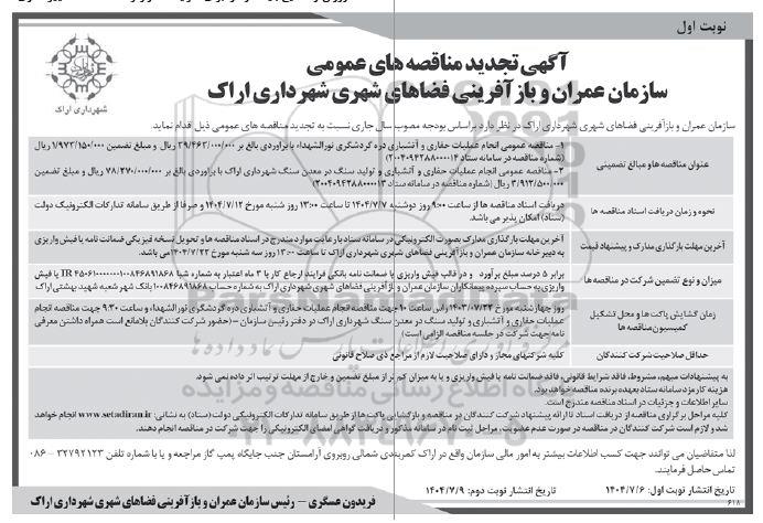 سازمان عمران و بازآفرینی فضاهای شهری شهرداری اراک در نظر دارد بر اساس بودجه مصوب سال جاری نسبت به برگزاری مناقصه های عمومی ذیل اقدام نماید.
