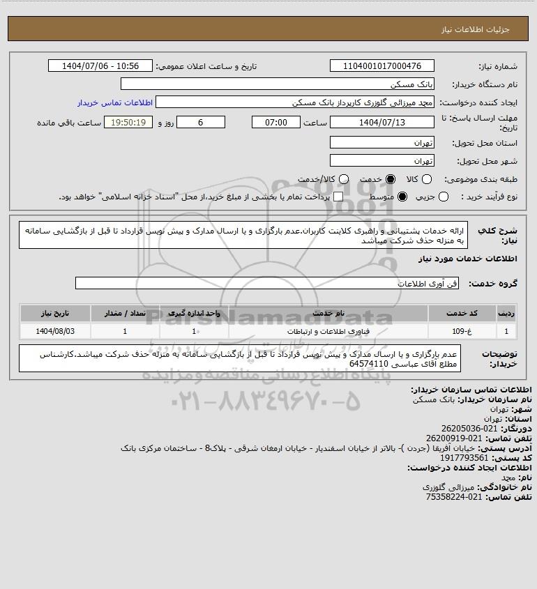 شرح کلی نیاز: ارائه خدمات پشتیبانی و راهبری کلاینت کاربران.عدم بارگزاری و یا ارسال مدارک و پیش نویس قرارداد تا قبل از بازگشایی سامانه به منزله حذف شرکت میباشد