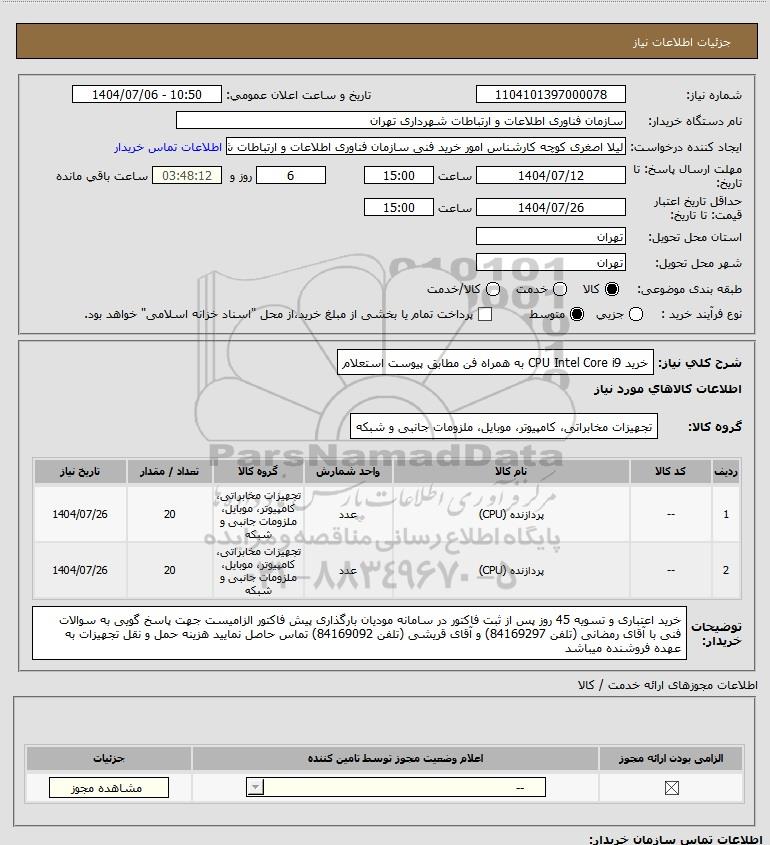 | 2 | -- | پردازنده (CPU) | عدد | تجهیزات مخابراتی، کامپیوتر، موبایل، ملزومات جانبی و شبکه | 20 | 1404/07/26 |