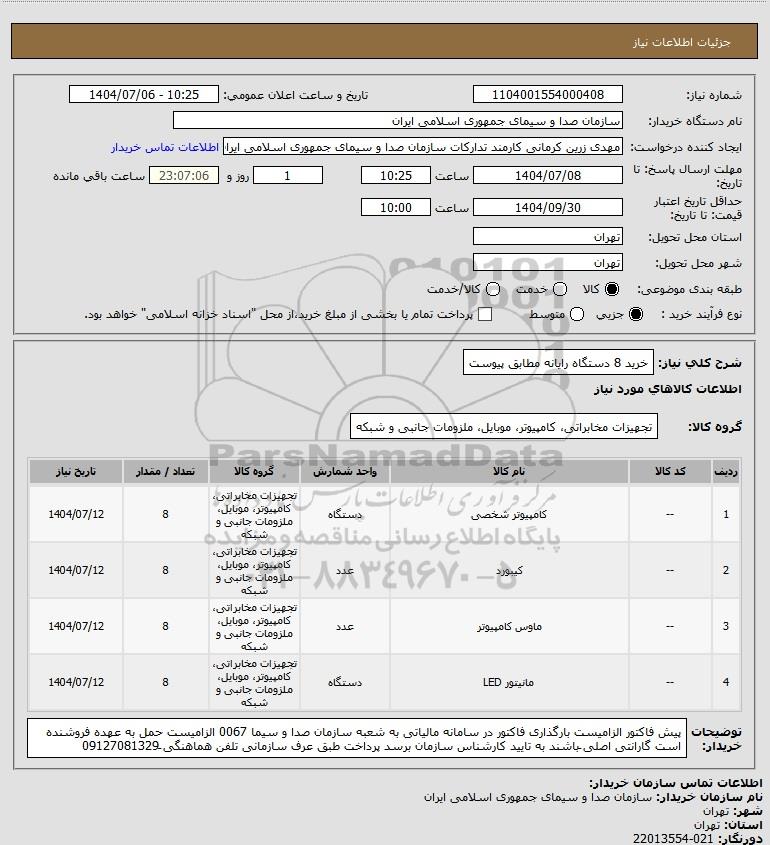 شرح کلی نیاز: خرید 8 دستگاه رایانه مطابق پیوست