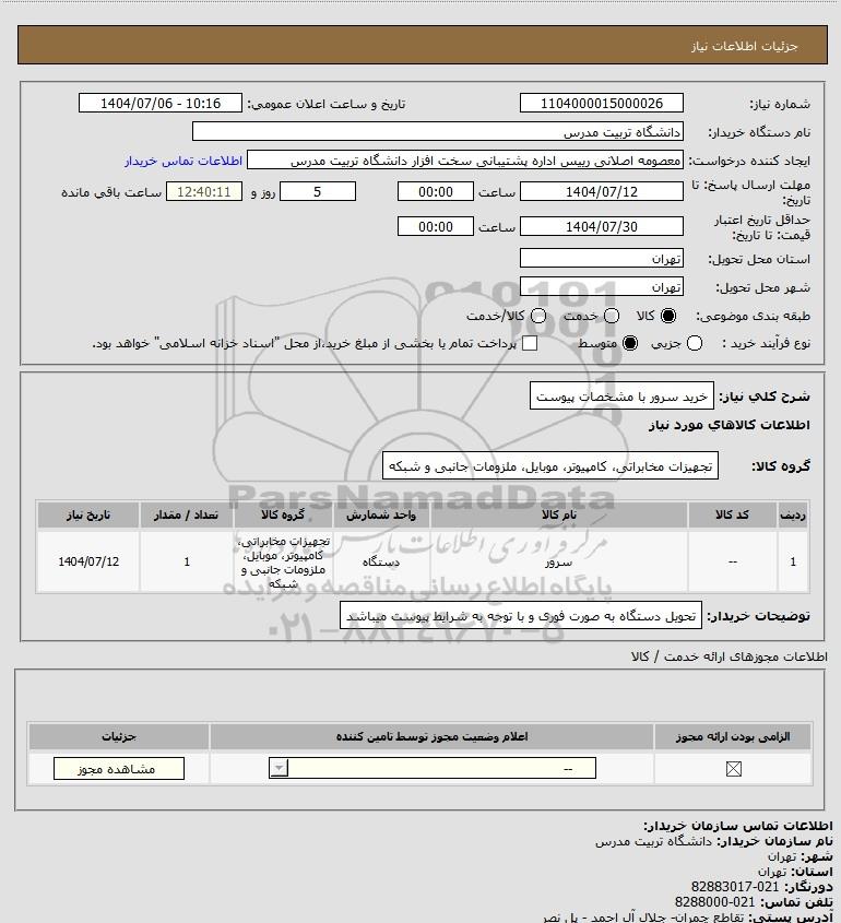 | 1 | -- | سرور | دستگاه | تجهیزات مخابراتی، کامپیوتر، موبایل، ملزومات جانبی و شبکه | 1 | 1404/07/12 |