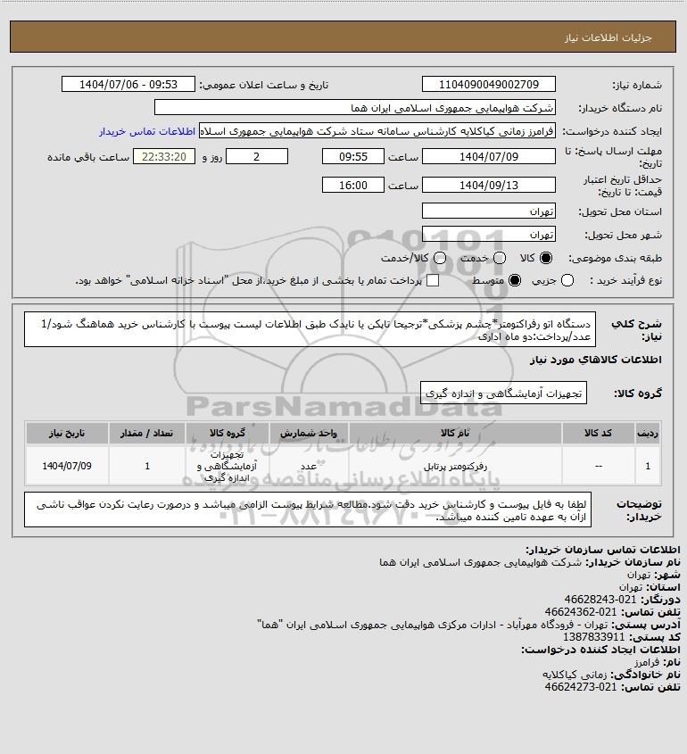 شرح کلی نیاز: دستگاه اتو رفراکتومتر*چشم پزشکی*ترجیحا تاپکن یا نایدک طبق اطلاعات لیست پیوست با کارشناس خرید هماهنگ شود/1 عدد/پرداخت:دو ماه اداری