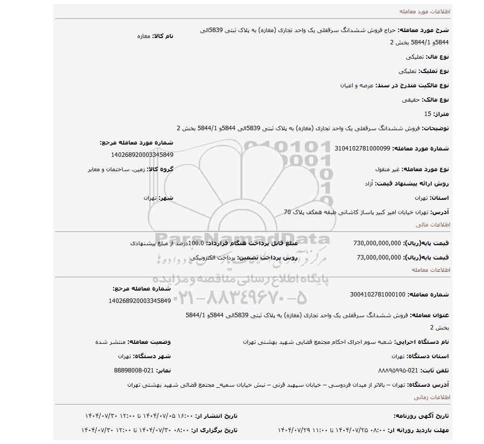 قیمت پایه(ریال): 73,000,000,000روش پرداخت تضمین: پرداخت الکترونیکی