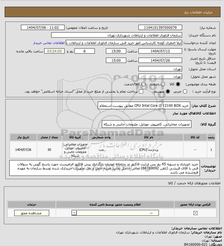 1 -- پردازنده (CPU) عدد تجهیزات مخابراتی، کامپیوتر، موبایل، ملزومات جانبی و شبکه 50 1404/07/26